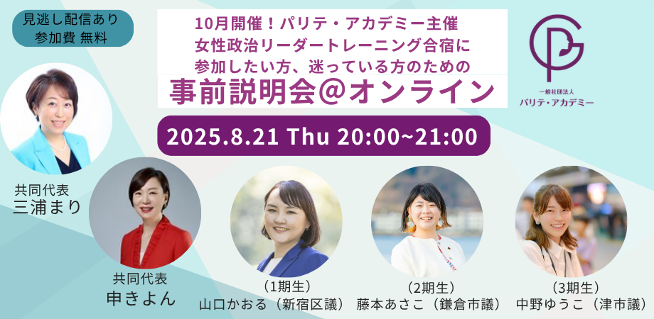 [2025/08/21] オンライン説明会 女性政治リーダートレーニング合宿2025年10月開催@パリテ・アカデミー