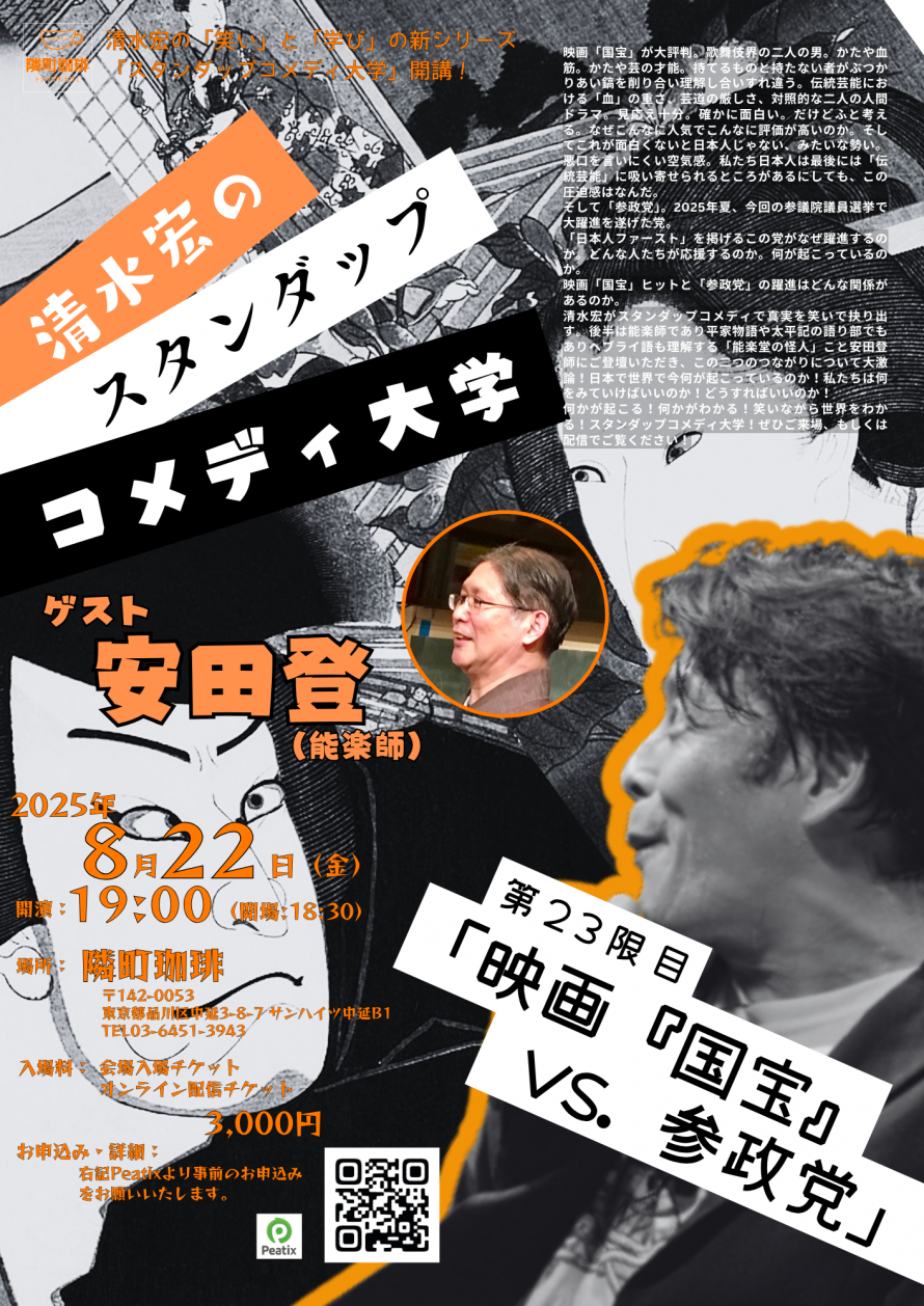 清水宏がスタンダップコメディで真実を笑いで抉り出す。後半は能楽師であり平家物語や太平記の語り部でもありヘブライ語も理解する「能楽堂の怪人」こと安田登師にご登壇いただき、この二つのつながりについて大激論!日本で世界で今何が起こっているのか!私たちは何をみていけばいいのか!どうすればいいのか!