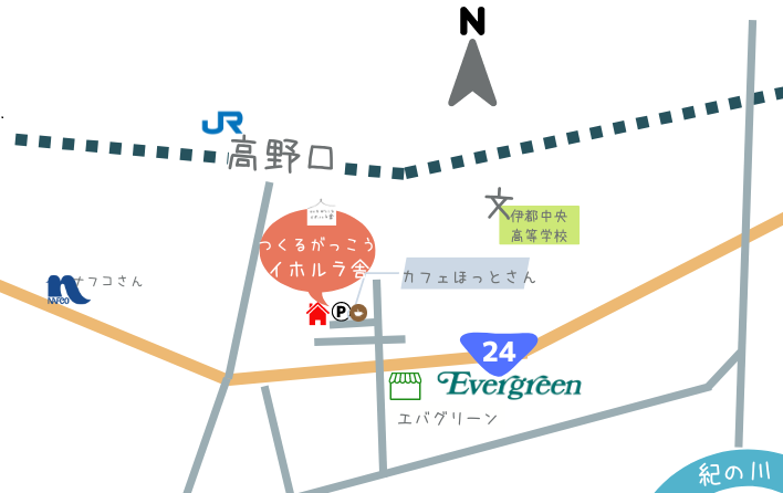 ※お車の方は24号線のエバグリーン 高野口店の交差点を北上、2つ目左折したところにある「カフェほっとさん」の西側にある駐車場に止めてください。ナビに従うと駐車場に辿り着けなくなることがあります。
